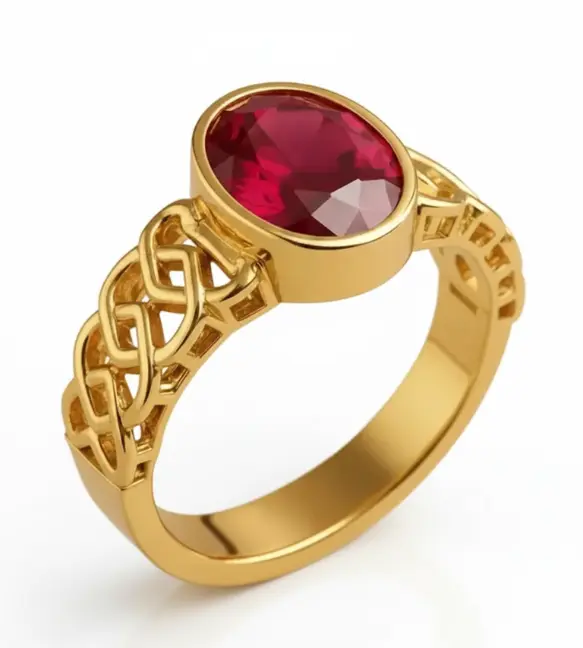 Celtic Ruby Gold Ring ultimately represents harmony between history and sophistication. The luminous ruby commands attention, while the interwoven gold band rewards closer admiration. Together they create jewellery that feels meaningful, elegant, and enduring — a piece designed not only to adorn but to symbolize connection and legacy.