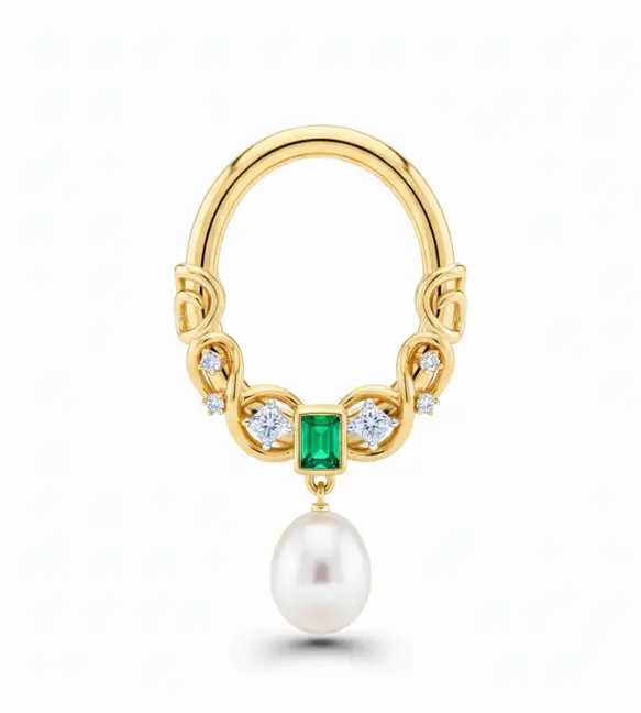 Emerald Pearl Septum Ring 18K is a refined expression of modern Indian nose jewellery, combining gemstone brilliance with delicate elegance. Designed for those who appreciate distinctive and luxurious piercing jewellery, this septum ring features a vibrant green emerald centerpiece, shimmering diamond accents, and a graceful pearl drop that creates movement and charm. The design blends contemporary styling with classic Indian jewellery elements, making it both fashionable and culturally inspired.