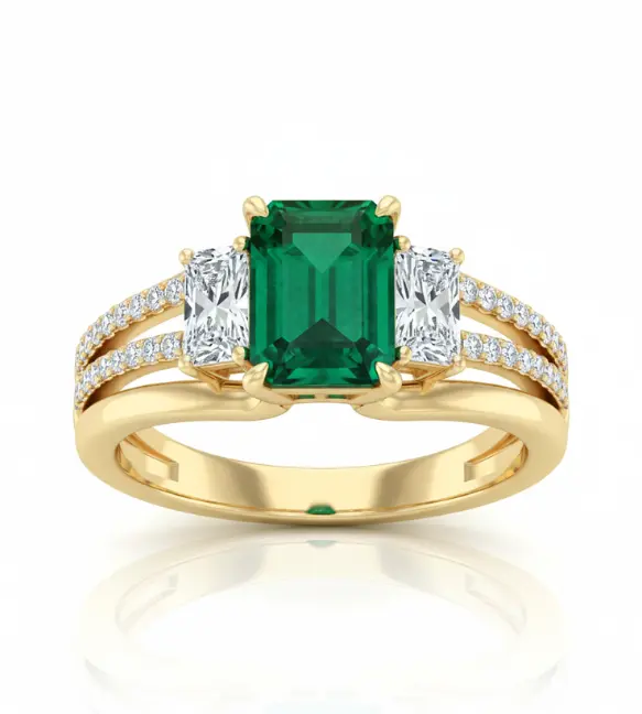 Embrace refined elegance with this captivating emerald and diamond ring, beautifully crafted in rich 18K yellow gold. Designed to highlight both color and brilliance, this luxurious piece features a striking emerald-cut green gemstone at its center, complemented by shimmering side diamonds and a graceful split shank band. The harmonious balance of vibrant hue, radiant sparkle, and precious metal creates a ring that feels both timeless and contemporary.